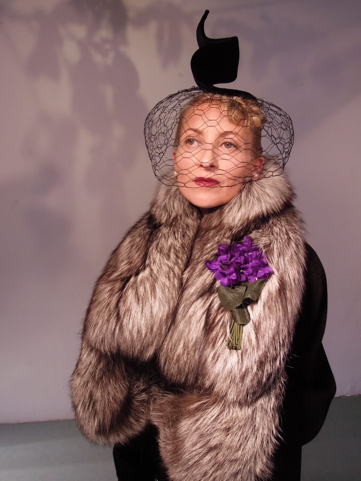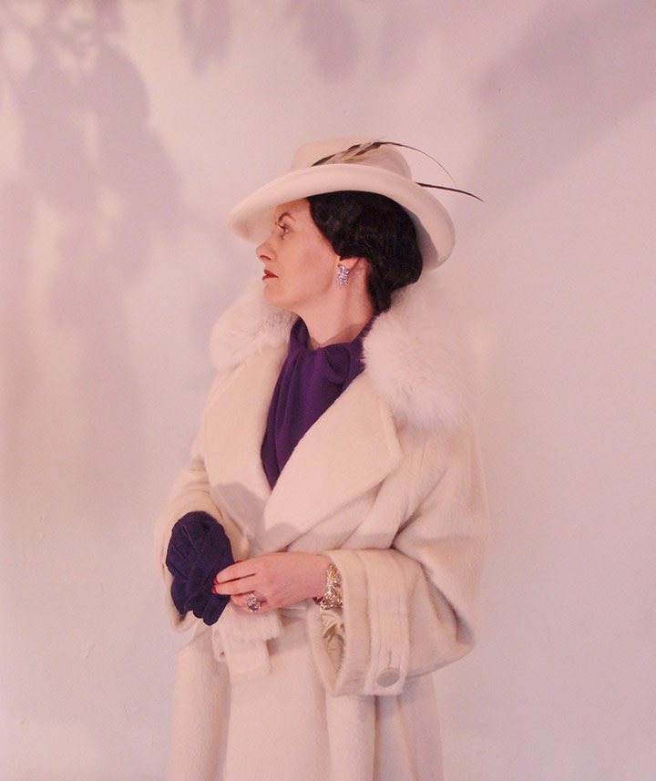 Coat in cream alpaca with arctic fox collar, millinery en suite
