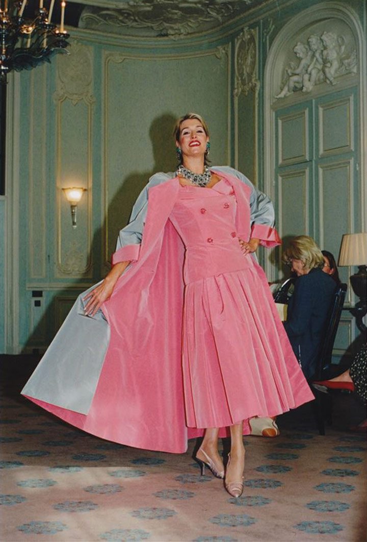 Dress and coat ensemble in sunset pink and silver grey silk taffeta Dress and coat ensemble in sunset pink and silver grey silk taffeta